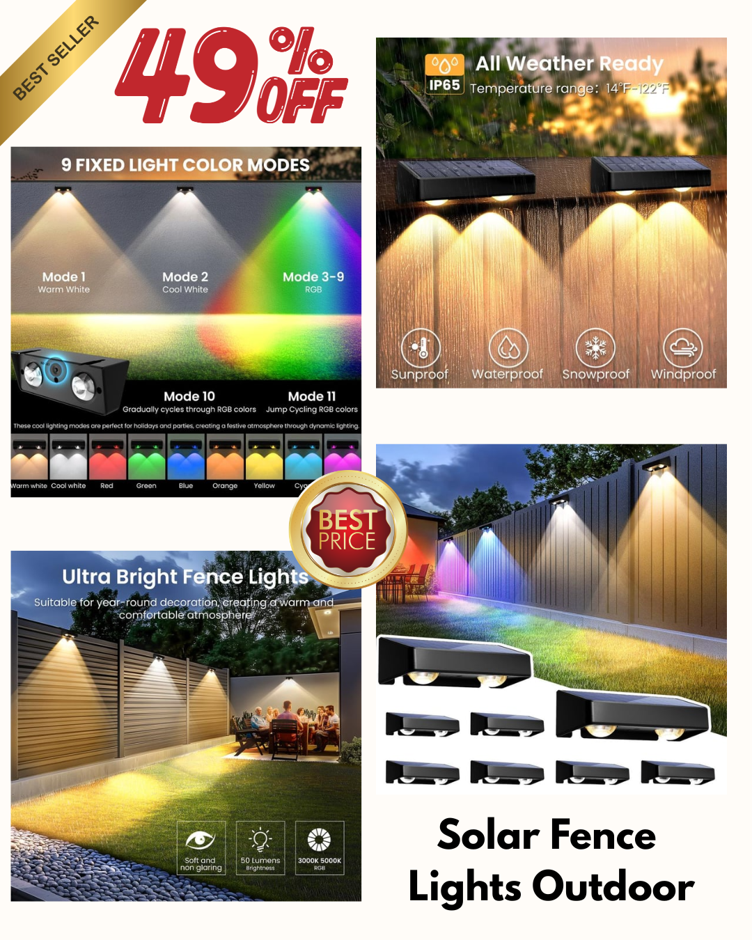 ćColorful Lighting & Multiple ModesćOur solar fence lights offer 8 distinct lighting modes, including Warm White, Red, Green, Blue, Yellow and Cyan, as well as 2 RGB cycle modes (smooth changing and flash changing). Warm White is perfect for everyday lighting, while the RGB modes add vibrant colors for festive decorations or special occasions. Whether you want to enhance your homeās ambiance or decorate for Christmas, Halloween, or other holidays, these outdoor solar lights effortlessly meet your needs, creating a dreamy and romantic atmosphere.